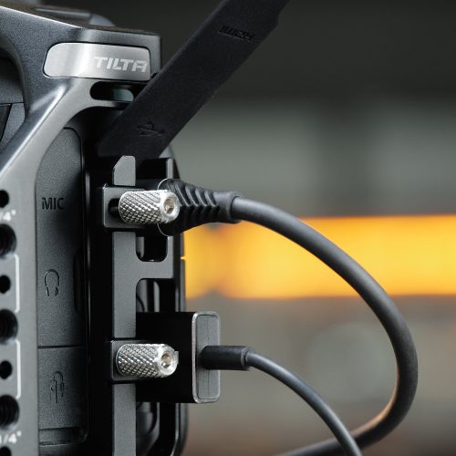 The included Cable Clamp mounts to the side of the cage and provides additional security for a USB-C and HDMI Cable.