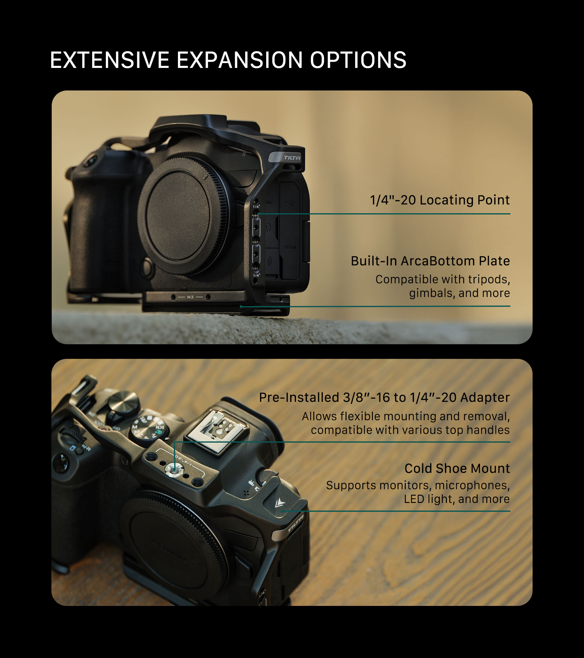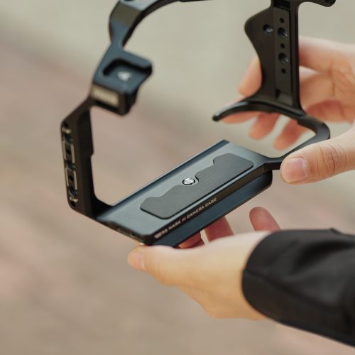 This cage serves as the foundation to mount additional accessories via mounting points such as a Cold Shoe Receiver, 3/8″-16 and 1/4″-20 Threads with Locating Points. The included 3/8″ to 1/4″ adapter helps expand mounting options for top handles.